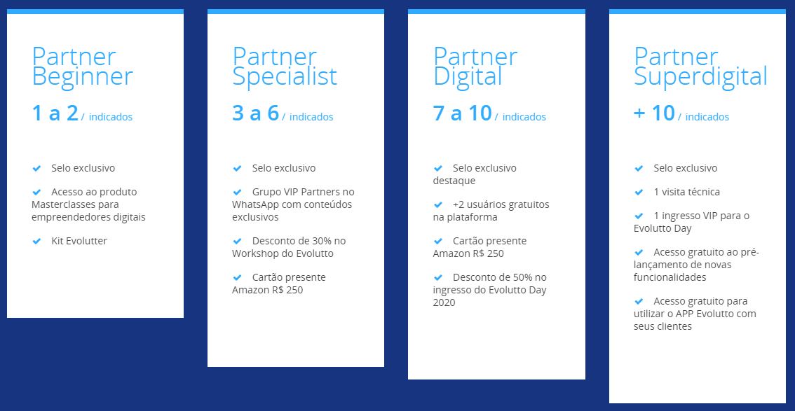 Cada selo corresponde ao nível que você pertence dentro do programa de indicações Evolutto Digital Partners.