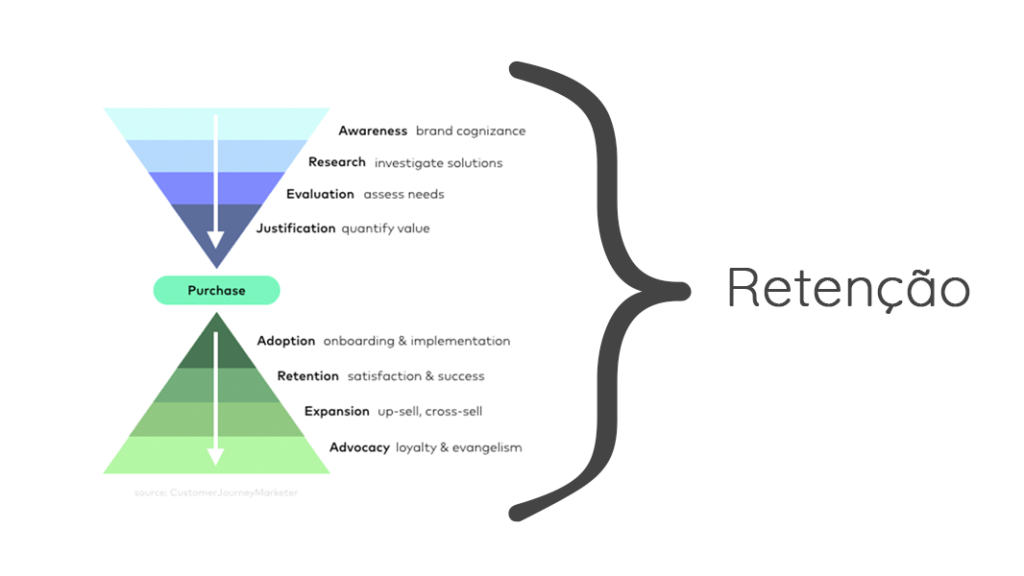 Separei essa imagem para você dar uma olhada em um possível novo funil, que alguns chamam de ampulheta. Veja que a jornada não acaba na venda, ela vai muito além.